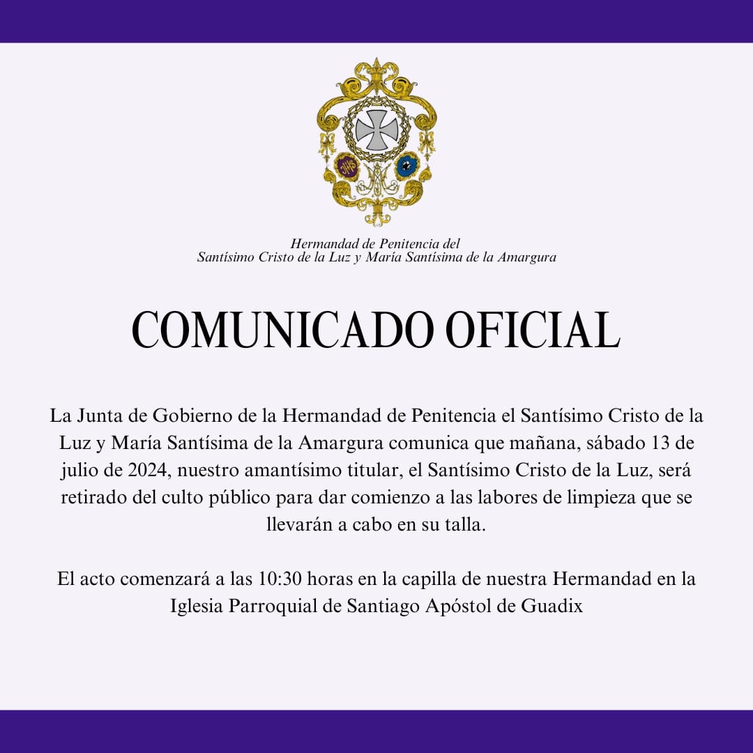 jul. 13 RETIRADA DEL CULTO PÚBLICO DEL STMO. CRISTO DE LA LUZ POR LABORES DE LIMPIEZA Estimado hermano en Cristo,Por orden del hermano mayor le comunico que mañana, sábado 13 de julio de 2024, nuestro amantísimo titular,...